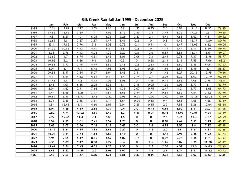Former CFWWC Board Member Don Loeffler has been collecting and sharing rainfall data from the Silk Creek Drainage. Below is the information that he has collected.