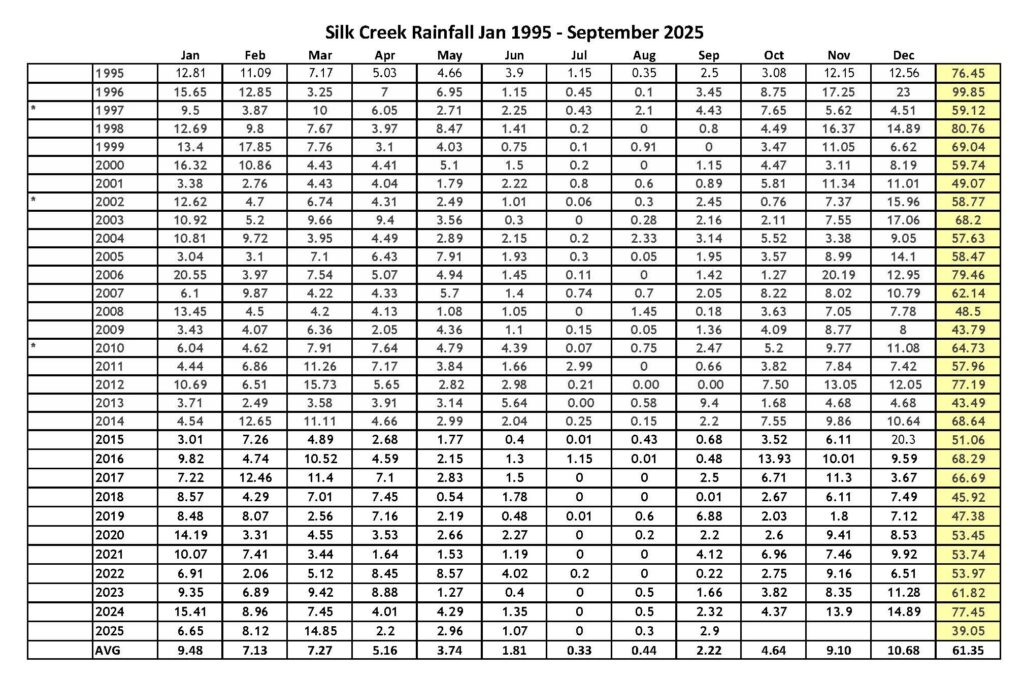 Former CFWWC Board Member Don Loeffler has been collecting and sharing rainfall data from the Silk Creek Drainage. Below is the information that he has collected.