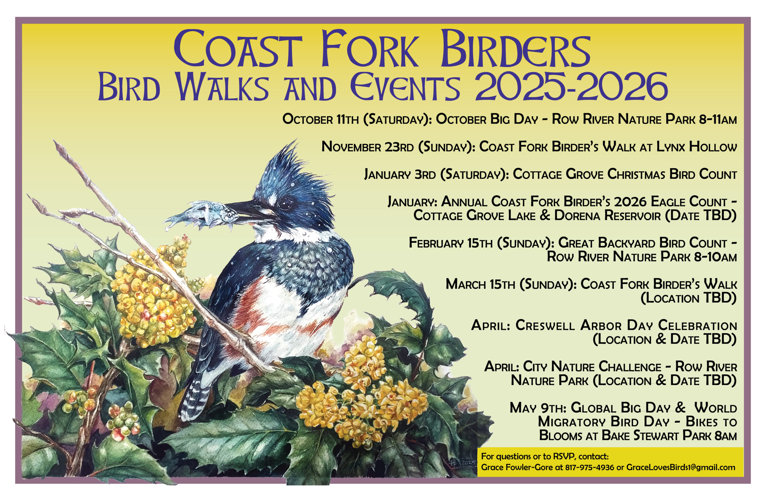 Join the Coast Fork Birders for a June bird and butterfly walk led by Grace Fowler-Gore and Alison Center. This beginner-friendly outing welcomes participants of all birding abilities. The terrain is primarily flat and the walk will be on paved and unpaved surfaces. Bring weather appropriate clothing and footwear, water, snack, binoculars and bird identification book.