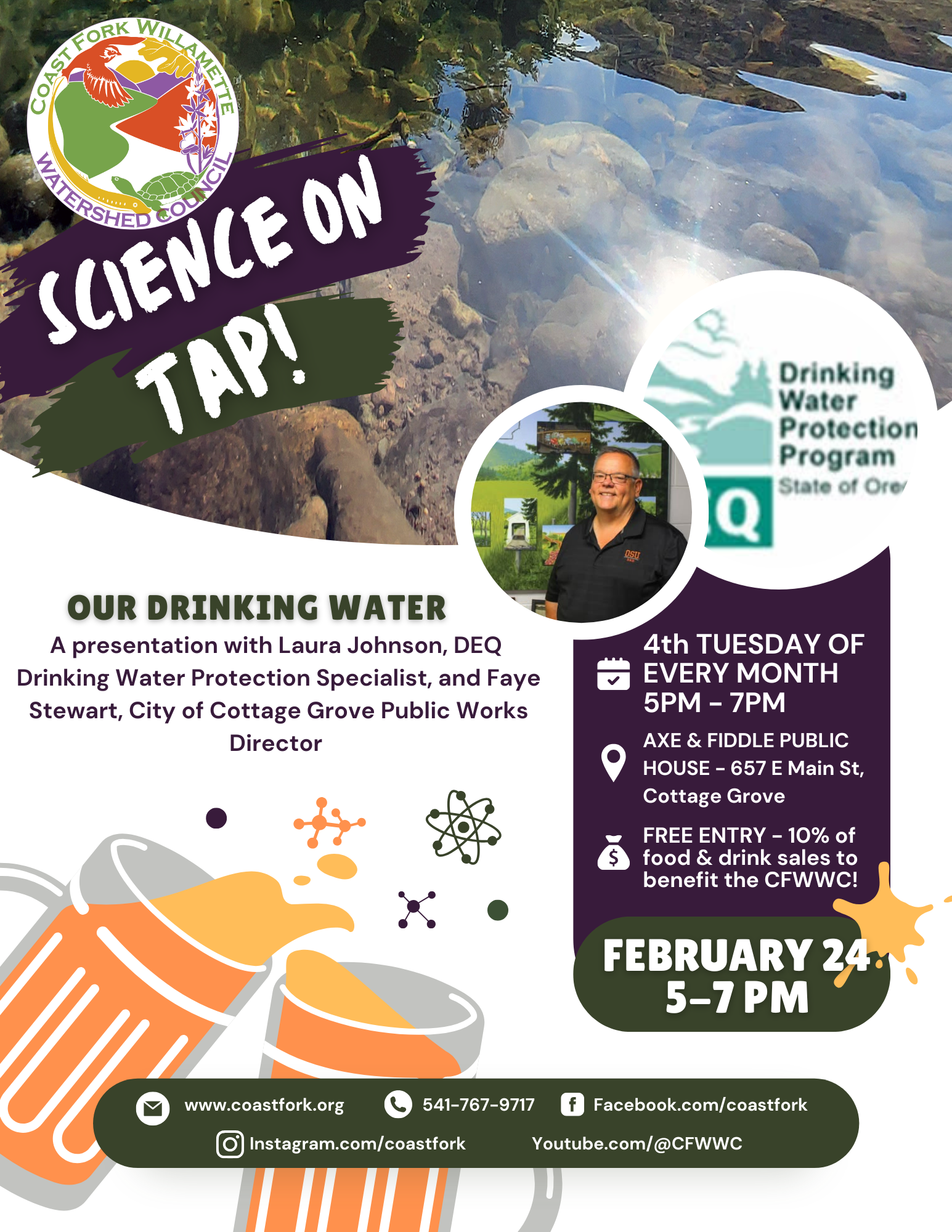 The Coast Fork Willamette Watershed Council (CFWWC) hosts a family-friendly monthly public meeting series called Science on Tap on the fourth Tuesday of each month from 5-7pm at the Axe & Fiddle, 657 E. Main Street in Cottage Grove. The event begins with informal socializing, trivia, and updates about the watershed and watershed council. The Science on Tap presentation begins at 6pm. CFWWC receives 10% of all sales from the evening between 5-7:30pm. The event is free to the public, with a $5 donation suggested.