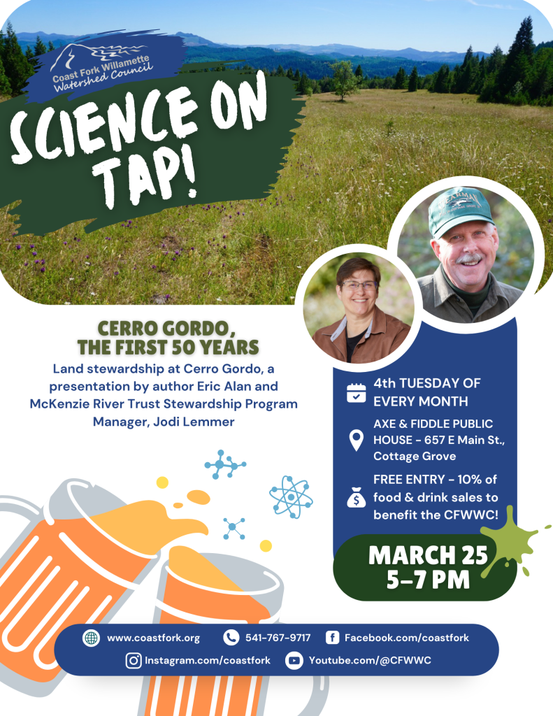 Our March event celebrates 50 years of land stewardship at Cerro Gordo, a presentation by author Eric Alan and McKenzie River Trust Stewardship Program Manager, Jodi Lemmer.