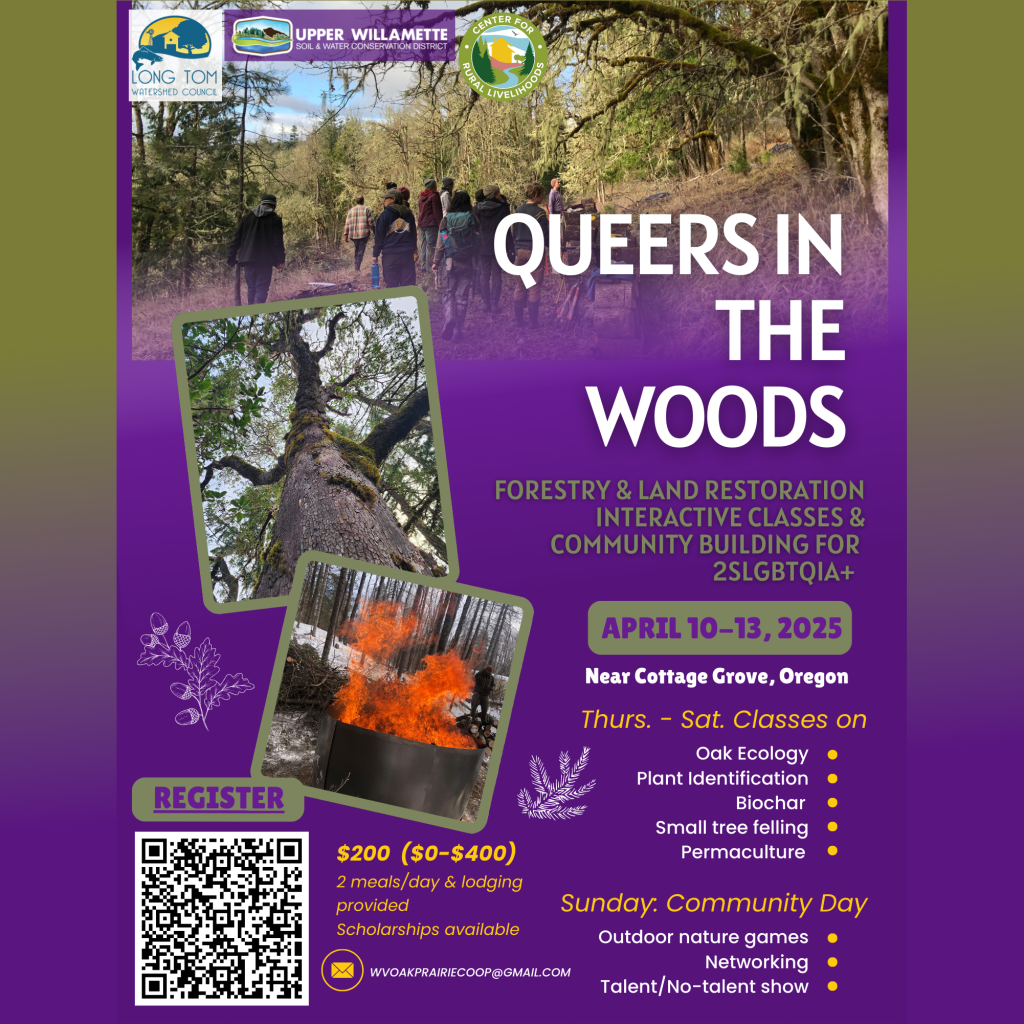 This four day workshop has been created to build community and skills around land stewardship/tending, restoration, and management for the 2SLGBTQIA+ community. Led by experienced queer land managers and educators, this workshop is an opportunity to work in community to explore or deepen your own knowledge of restoration practices along with land connection and understanding natural relationships, specifically for Willamette Valley ecosystems. This workshop aims to build and expand the network of folks working as stewards of our local ecosystems. We support and actively work towards land back and land justice. Maximum 16 participants.