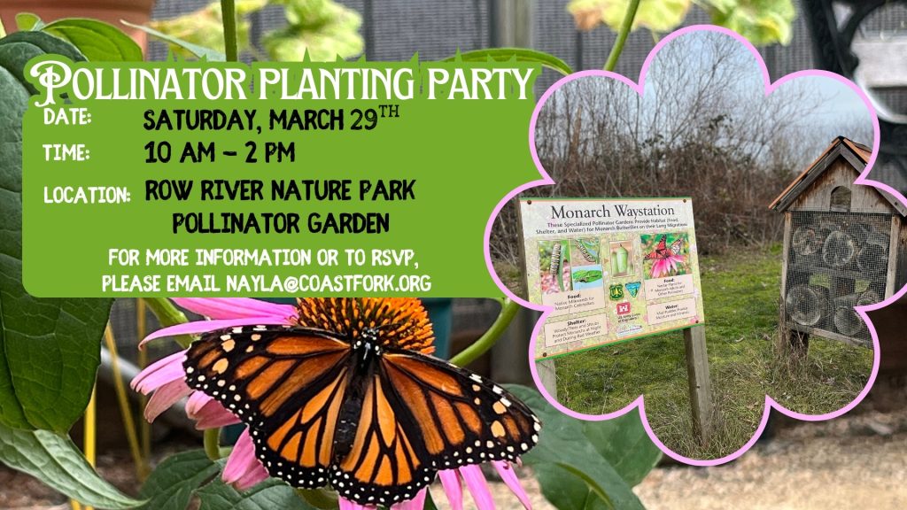 Join us from 10am to 2pm on Saturday, March 29th for our next volunteer work party at Row River Nature Park’s Pollinator Garden!