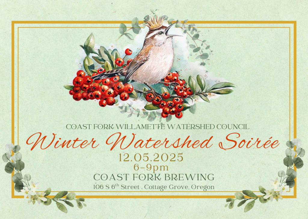 At the Winter Watershed Soirée we get to publicly recognize the individuals and organizations that go the extra mile in their efforts to benefit our council, and the Coast Fork Willamette Watershed as a whole. It’s when we get to tell you about and the progress and accomplishments this council was able to achieve throughout the year, and it’s when you get to feel great about the real positive difference you are helping to make!